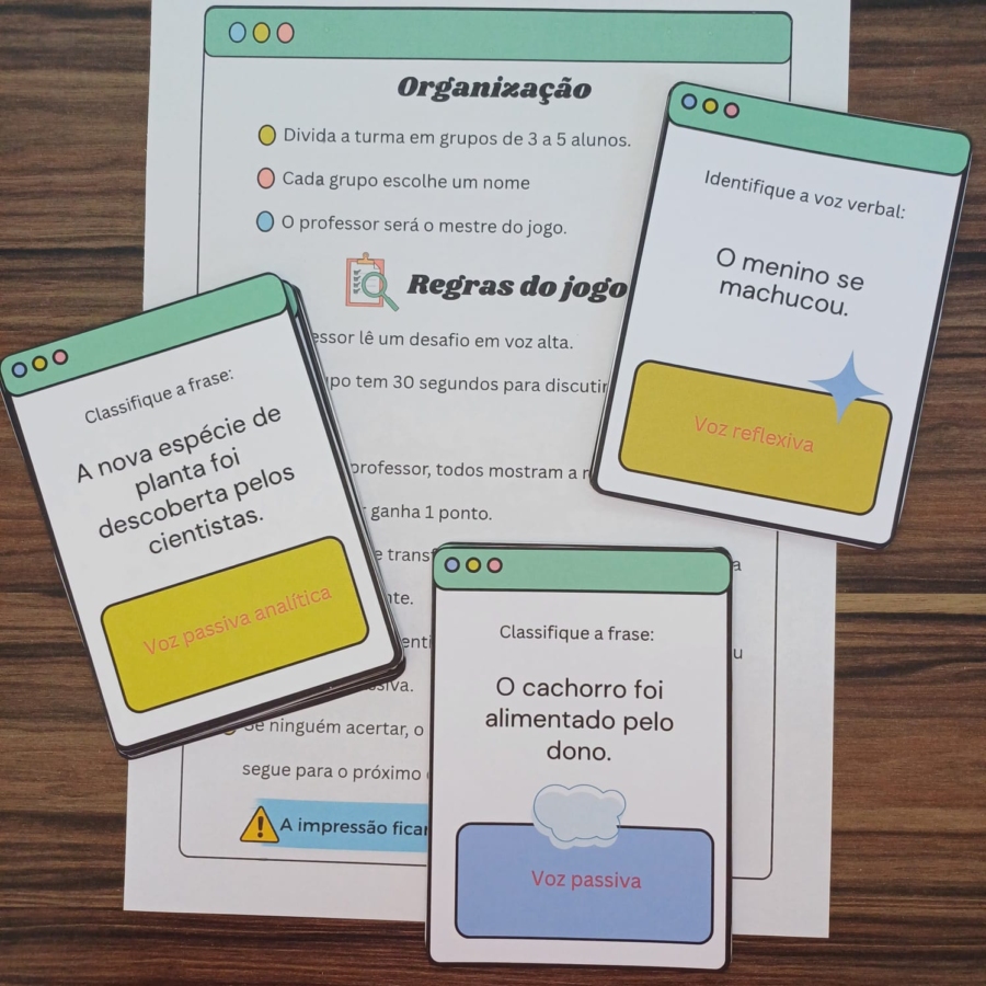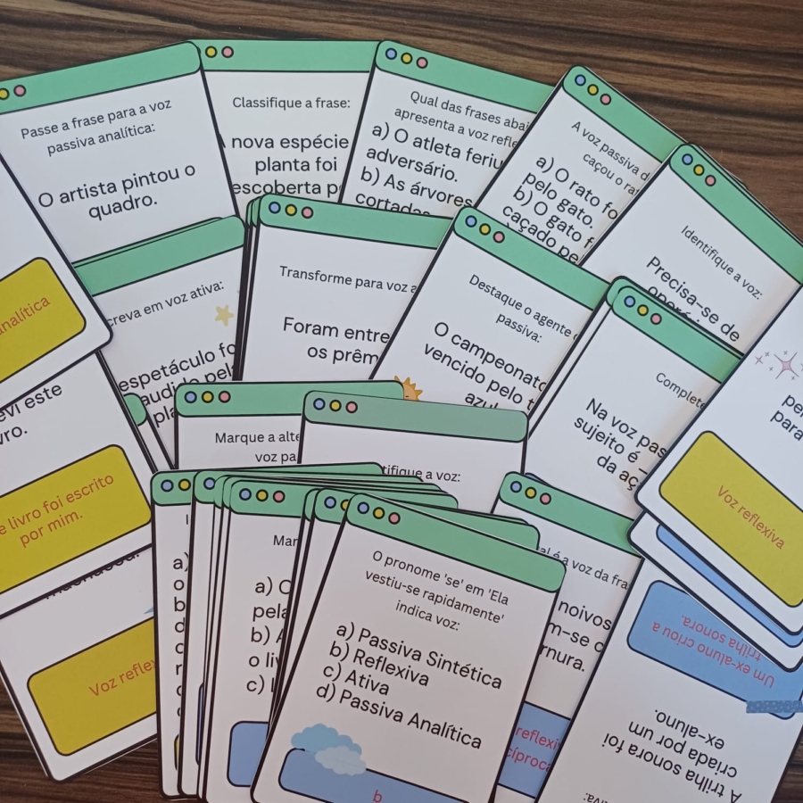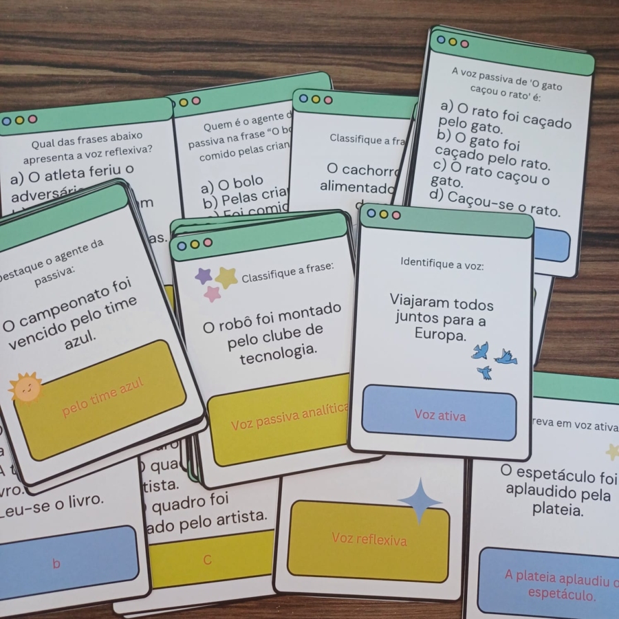 É um jogo envolvente que transforma o estudo da voz ativa, passiva e reflexiva em uma experiência dinâmica e divertida em sala de aula. Por meio de perguntas estratégicas, os alunos precisam identificar, analisar e responder corretamente sobre as vozes verbais, colocando em prática o que aprenderam de forma ativa.
