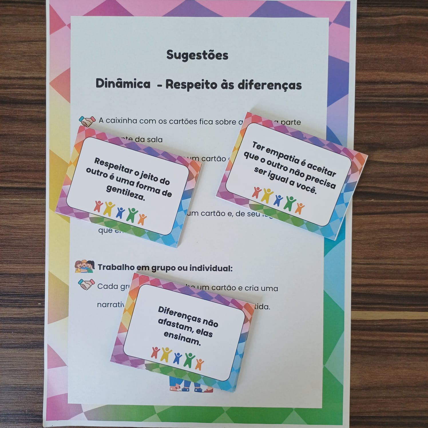 Os cartões de empatia e conscientização trazem frases que provocam reflexão, incentivam o respeito e ajudam os alunos a se colocarem no lugar do outro. É um recurso simples de aplicar, mas com um impacto profundo — daqueles que ultrapassam a sala de aula.